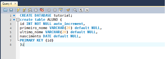 Observe que o nome do banco de dados no MySQL é tutorial. O login do banco é root e a senha é 123456. Durante a execução do código, o java.sql.DriverManager tentará abrir uma conexão com o banco, que só será possível caso a String dada como parâmetro seja aceita pelo DriverManager. Criando o Banco de Dados Caso queira criar uma banco exatamente como o do exemplo execute as seguintes querys no seu MySQL Workbench. Caso ainda não possua o MySQL Server ou o Workbench, ambos podem ser baixado no pacote MySQL Installer. CREATE DATABASE tutorial; create table ALUNO ( id INT NOT NULL auto_increment, primeiro_nome VARCHAR(20) default NULL, ultimo_nome VARCHAR(20) default NULL, nascimento DATE default NULL, PRIMARY KEY (id) );