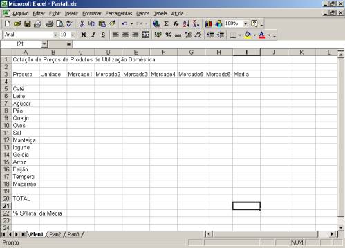 - Construir uma Tabela de Cotação de Preços de Produtos de Utilização Doméstica, com a aparência semelhante à figura a seguir: