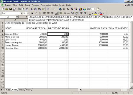 Construa uma planilha de cálculo para calcular imposto de renda de
